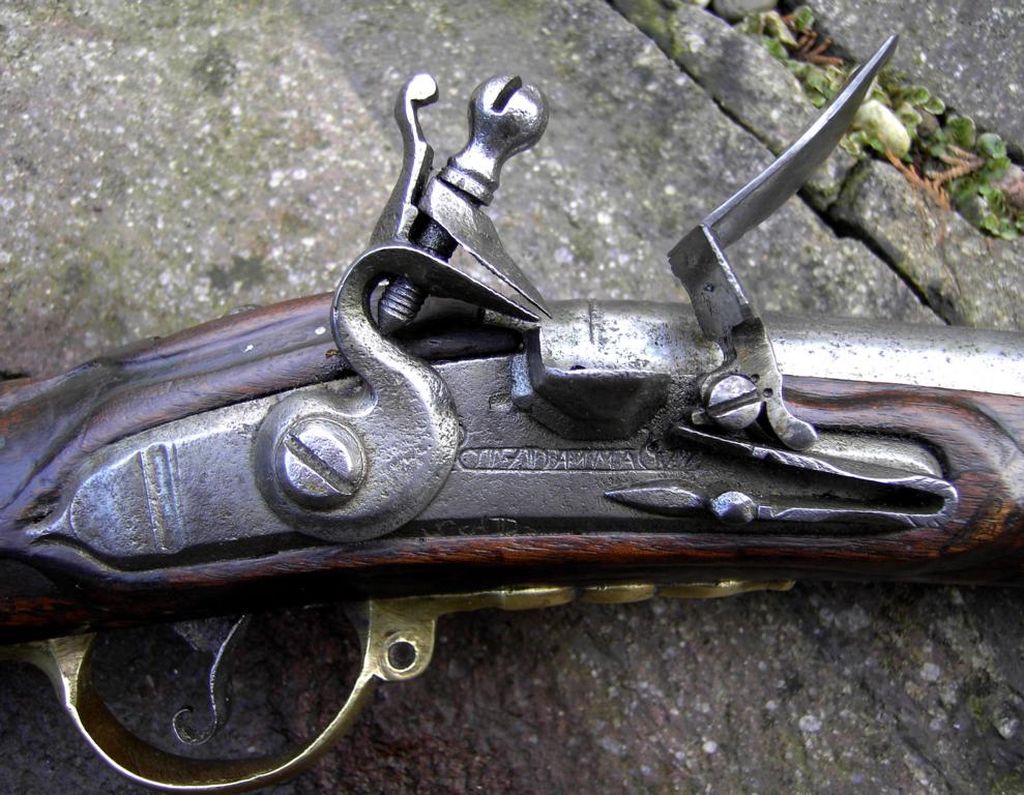 rautenförmigen Verschneidungen. Messingbeschläge bestehend aus Mündungsblech am Vorderschaft, drei kantigen, aufgetrichterten Ladestockröhrchen, wobei bei den beiden ersten Röhrchen der Trichter jeweils zur Hälfte abgefeilt wurde, einteiligem Abzugsbügel mit Verlängerung nach hinten und vorne, Kolbenblech mit ausgeprägter Nase für drei Schrauben auf der Kolbenoberseite, schlangenförmigem Schlossgegenblech mit abgeschrägten Kanten und drei Schrauben sowie Daumenblech mit Herrscher-Chiffre auf dem Kolbenhals. Flaches Steinschloss entsprechend dem Muster 1731 mit flachem Schloßblech, abgeschrägten Kanten und ebensolchem Schwanenhalshahn; eckige Eisenpfanne ohne Verbindung zur Batterie; Batteriefeder von der Schlossinnenseite her verschraubt. Eiserne Sattelstange mit eisernem Ring um Lauf und Schaft und Fixierung an der hinteren Schlossschraube, diese mit vorgeschriebenem Rundkopf; der Sattelstangenring fehlt. Kimme in das Schwanzschraubenblatt eingefeilt, Messing-Ovalkorn auf dem Lauf. Auf der gesamten Länge runder Lauf mit zwei Kanellierungen am Pulversack. Lauf/Schaftverbindung durch Kreuzschraube, Sattelstangen-Laufring und vordere Riemenöse.