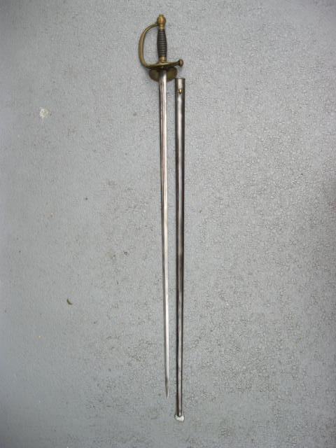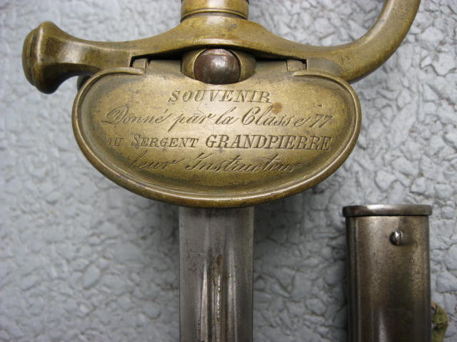 Hier mal ein Geschenkdegen für einen Genieunteroffizier.Die Scheide wurde dahingehend modifiziert,daß das Ringband u.Ring entfernt wurden.An dessen Stelle kam ein runder Trageknopf.Er sollte zum Andenken sein, gegeben durch den Rekrutenjahrgang 77 dem Sergeanten Grandpierre ihrem Instrukteur.Ich bringe ihn mit nach Schleswig u. er ist zuhaben.
