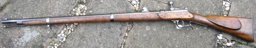Damit das Bild etwas vollständiger wird, nachfolgend das Foto eines von zwei bekannten Zündnadel-Kadettengewehren, gefertigt bei Georg Hänel/Suhl aus einer ZN-Defensionsbüchse Na/M in einer Anzahl von 904 Stücken. Eines der beiden Gewehre zeigt auf der Nase des Kolbenblechs den Truppenstempel "P.C.C." des preußischen Cadetten-Corps. Siehe auch Wirtgen/Lander, Die Bewaffnung des Preußischen Kadettencorps mit Gewehren, S.310/311.