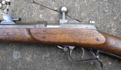 Leider besitze ich von der Defensionsbüchse Na/M kein verwertbares Foto. So stelle ich als Anhalt ein Foto des Gewehres ein. Der Unterschied zum Kadettengewehr liegt zum einen im anders geformten Abzugsbügel und in der Art des Vorderschaftabschlusses. Auch ist das Gewehr etwas länger. Das am Gewehr vorhandene Quadrantenvisier stammt von der Büchse und ist mit Ausnahme der Einteilung identisch mit dem des Kadettengewehrs, ist aber an diesem Gewehr nicht korrekt. Gruß