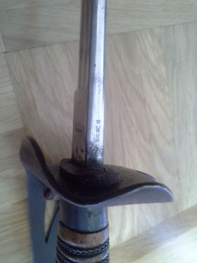 Man sollte aber bedenken, dass wir uns zeitlich mitten im Weltkrieg befinden. Allzu viele Degen dieses Musters werden sicher nicht mehr gefertigt worden sein. Viele Facharbeiter der Herstellerfirmen waren vielleicht zur Armee eingezogen, der Degen wurde im "Rohzustand" von verbliebenen Fachkräften zusammengesetzt, angepasst und dann wieder auseinandergeschraubt, um ins Brünier-Bad zu kommen. Hier könnte man, um anschließend durch Hilfskräfte wieder ein passendes Stück zusammensetzen zu können, die zeitaufwendige Nummerierung angewendet haben.