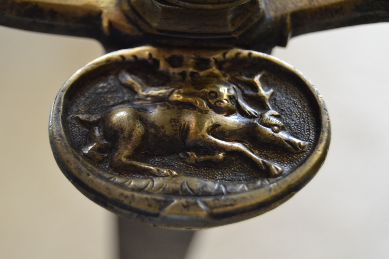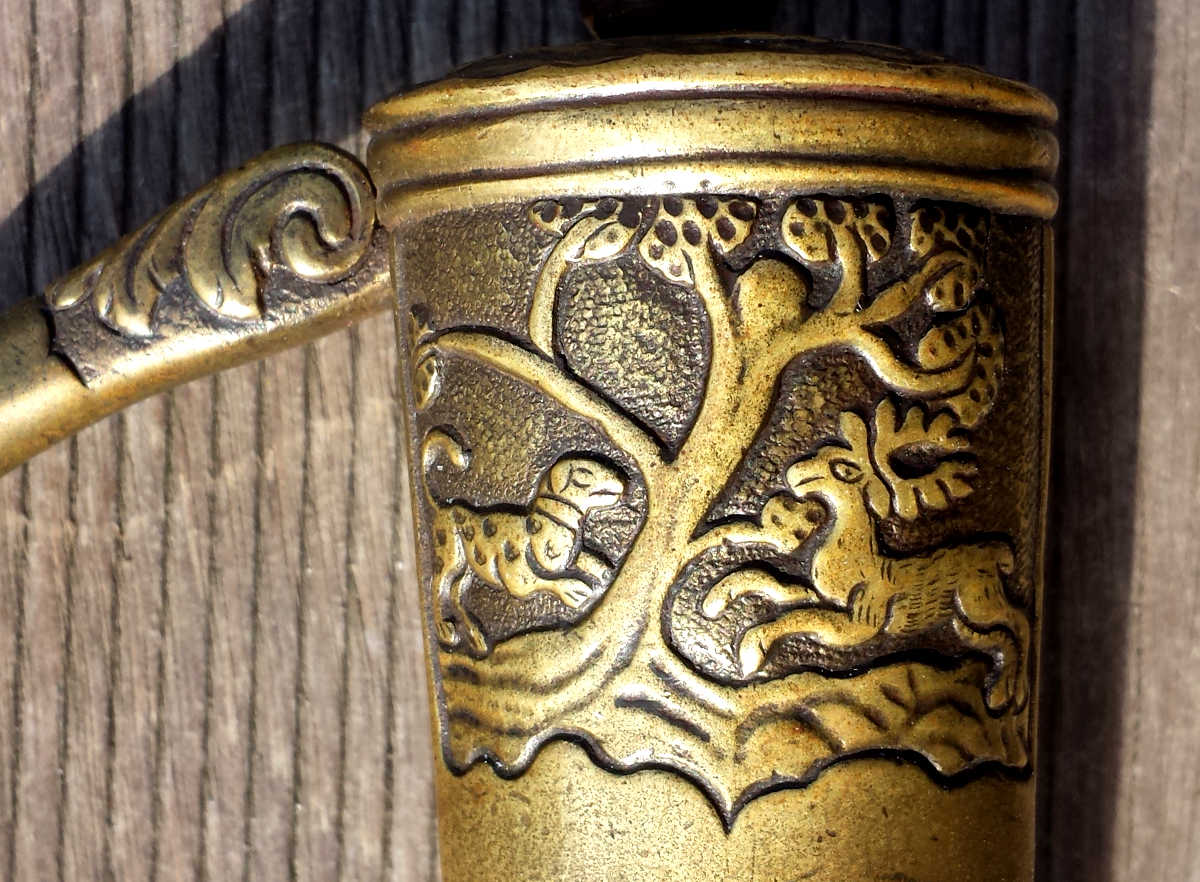 So sind auf diesem Hirschfänger zeitgenössische Jagdszenenen mit Wild und Hunden dargestellt.