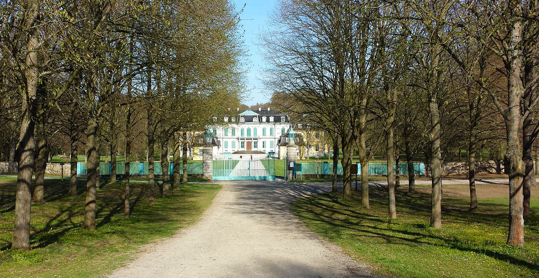 die Schlossallee vom "Lindenrondell" aus gesehen, dem Treffpunkt der Jagdgesellschaften (der kleine türkise Punkt am Ende der Allee ist Schloss Wilhelmsthal),