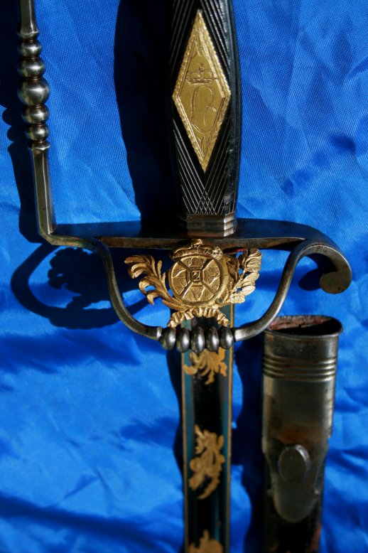 Militär Arzt Degen Bayern,Variante mit Fürstlichen Wappen,Terzseitig Oettingen -Wallerstein,mit Griffemblem (L) mit Fürstenkrone(handgraviert)für Fürst Ludwig Kraft Ernst zu Oettingen-Wallerstein(Fürst von 1802-1823)im ersten drittel gebläut,vergoldet und graviert mit Scheide.1813 leitete er die allgemeine Landesbewaffnung in Schwaben,Südfranken und einen Teil Altbayerns.