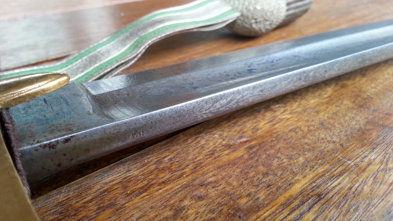 Der Säbel hat übrigens tatsächlich ( siehe Hinweis von Ulfbert ) die Händlerinschrift " G.H.Osang in Dresden " auf dem Klingenrücken.