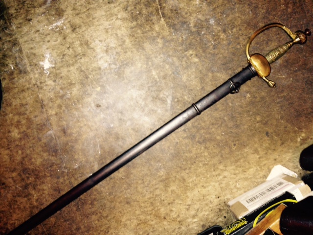 Dopplescharniert, mit spaetere Scheide, aber die passt sehr gut auf die Klinge.. Man denkt; Der Eigentuemer war Offiziere fuer ein sehr lange Zeit..