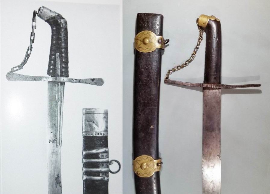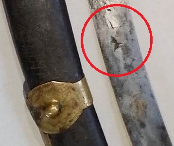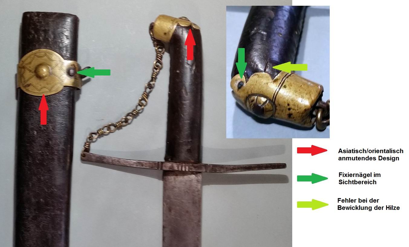 Diese Waffe hat überhaupt keine Gebrauchsspuren. Wäre sie so alt wie hier vermutet, hätten die Scheidenbänder am darunter liegenden Leder durch ständige Bewegung deutlichere Spuren hinterlassen, welche links und rechts von ihnen sichtbar sein sollten. Durch das fehlende Mundblech müsste das Leder am Einschub Schäden aufweisen.