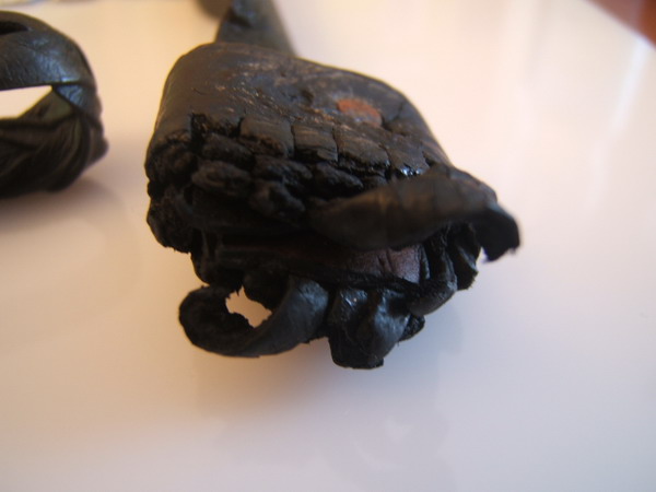 Zuerst habe ich die Quaste in lauwarmes Wasser gehängt, um den Kranz weich zu machen, damit er sich besser löst. Darunter kam der um die Enden des Lederriemen gewickelte und festgeklebte Lederstreifen mit den Resten der verlorenen Fransen zum Vorschein, welcher geleimt und mit 2 Nägeln zusammengehalten wird.