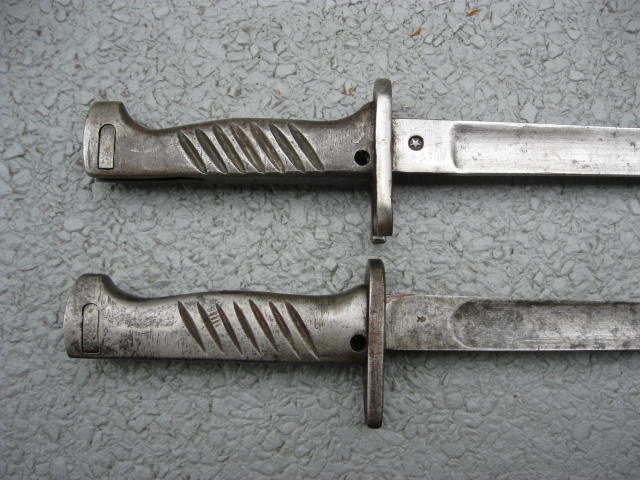 Ich möchte hier zwei Aushilfsseitengewehre mit Dillenklinge vorstellen.Bei dem ersten dürfte die Klinge von einem engl.Bayonett stammen.Bei dem zweiten Stück ist die Scheide englisch,aber die Klinge wohl nicht.Über der Sternmarke befindet sich noch eine kleine Kronenmarke.Vielleicht fällt jemand was ein.