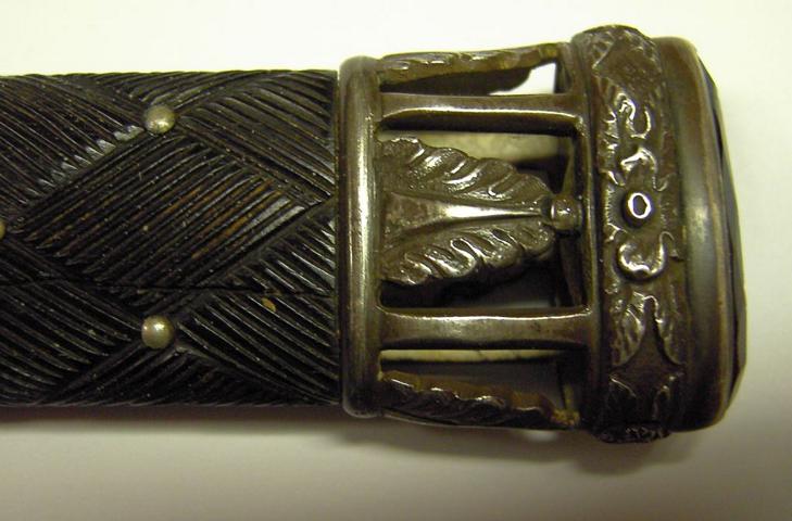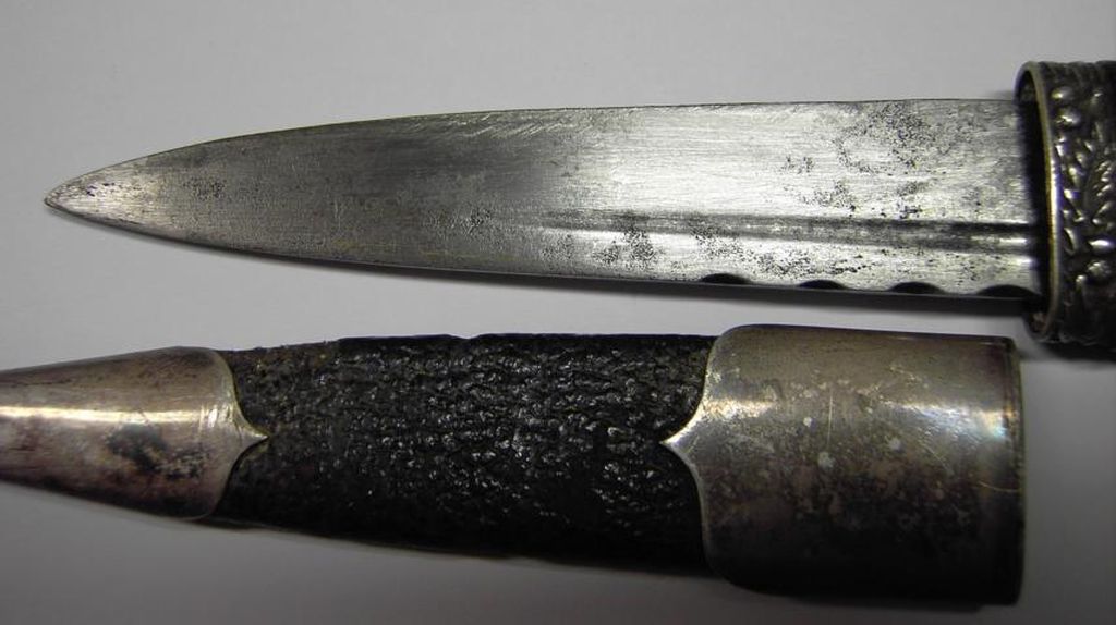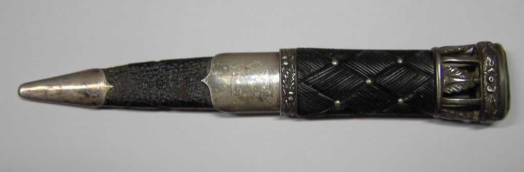 Obwohl hier bisher nur militärische Stücke gezeigt wurden, wage ich es, dennoch, einen schottischen Strumpfdolch, einen sogenannten Skean Dhu vorzustellen. Dieser kleine Dolch gehört auch noch heute zur schottischen Tracht und wird im Kniestrumpf an der Wade getragen. Sein Design folgt alten,keltischen Traditionen. Seit dem 18. Jahrhundert gehört der Skean dhu zur Kilt-Ausrüstung der Highland-Schotten. Es wurde verdeckt getragen, weil es den Schotten durch den Disarming Act verboten war, Waffen zu tragen. Der Griff ist traditionell aus Ebenholz, die Scheide aus mit Leder überzogenem Holz.