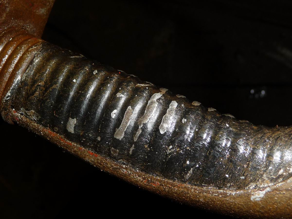 Unter der Farbe der Scheide kamen drei gespachtelte Stellen zutage (siehe letztes Foto). Zwei Dellen und ein Loch wurden auf diese Weise "repariert". Den Abbeizer habe ich nach längerer Einweichzeit abgewischt, dann Spachtelmasse und Restfarbe mit einem Propangasbrenner abgeflammt. Anschließend mit einer Drahtbürste entstaubt. und satt eingeölt. Nun ist sie zwar ganzflächig rostnarbig, dellig und mit einem Loch im Schleppblechbereich, aber ohne Verschlimmbesserungen.