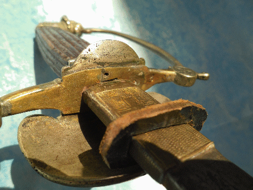 Klingenlänge (einschneidig) 81,5cm mit beidseitig zwei Hohlkehlen (rostnarbig), an der Fehlschärfe ca 2cm breit; diese ist fest mit einem Messingmantel umschlossen, der auf der Außenseite eine Art Blatt mit fünf lanzettigen Fingern zeigt, auf der Innenseite ein Kreuz. Stichblatt und Parierstange sind ebenfalls aus Messing, der Rest des Griffes aus einem silberfarbenen Metall.
