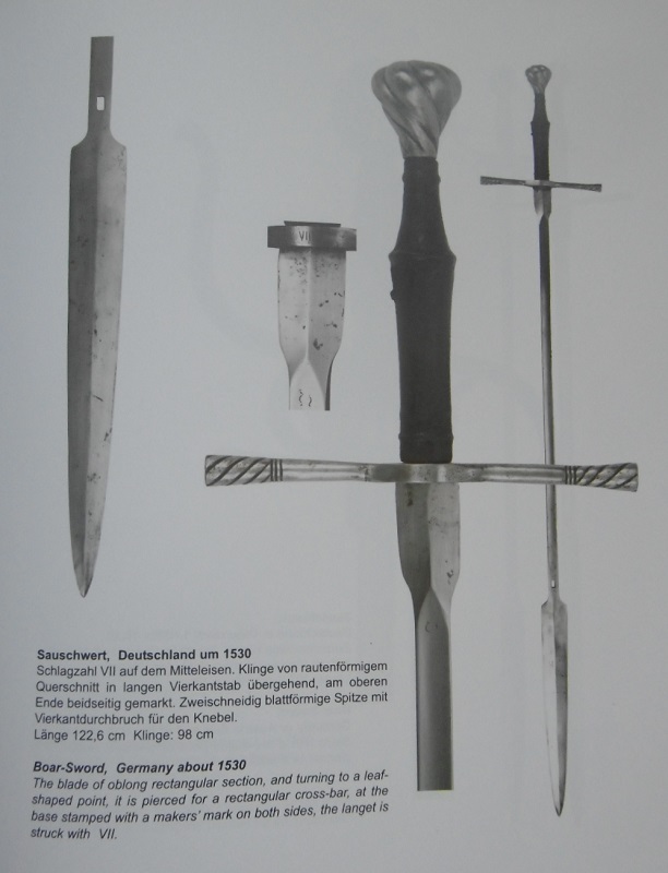 Falls notwendig und möglich, gab man auch Sauen - hauptsächlich Frischlingen und „schlechten Bachen“ (Döbel II, 65) - mit dieser Waffe den Fang. Auf grobe Sauen aber traten das Fangeisen (Saufeder) und vornehmlich im 16. Jahrhundert das Sau- oder Schweinschwert in Aktion.