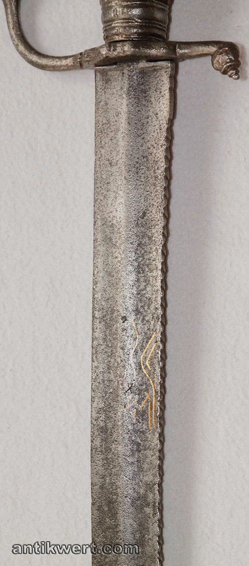 Die zweite Plaute ist etwa aus der Zeit um 1750 und hat ein versilbertes Gefäß. Hier dürfte die Säge wohl eher zum Showeffekt eingefeilt worden sein. Denn für den handwerklichen Gebrauch ist so eine Waffe zu Schade.
