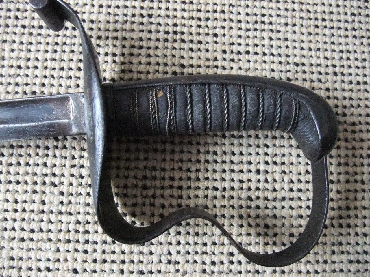 Eine Schwärzung der gesamten Waffe ist ungewöhnlich, nach dem Verlust der Griffbelederung erst recht. Es ist mir diesbezüglich keine Vorschrift bekannt. Vermutlich wollte hier jemand eine homogene Färbung des Säbels erreichen, damit das blanke Holz der Hilze nicht so auffällig erscheint. Das Eisen hatte durch Oxydation vermutlich schon eine dunkle Färbung angenommen.