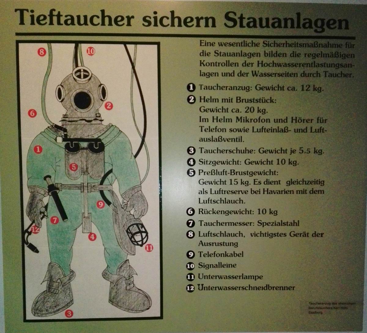 Im Zuge des Arbeitskreis-Treffens 2017 besuchten einige Teilnehmer auch das dem Hotel sehr nahe gelegene Wasserkraftmuseum. Obwohl mich, beruflich bedingt, die Energiegewinnung und den zugehörigen elektrischen Anlagen besonders interessieren, konzentriere ich mich auf den dort ausgestellten Degen, das Tauchermesser und die Uniformstücke.
