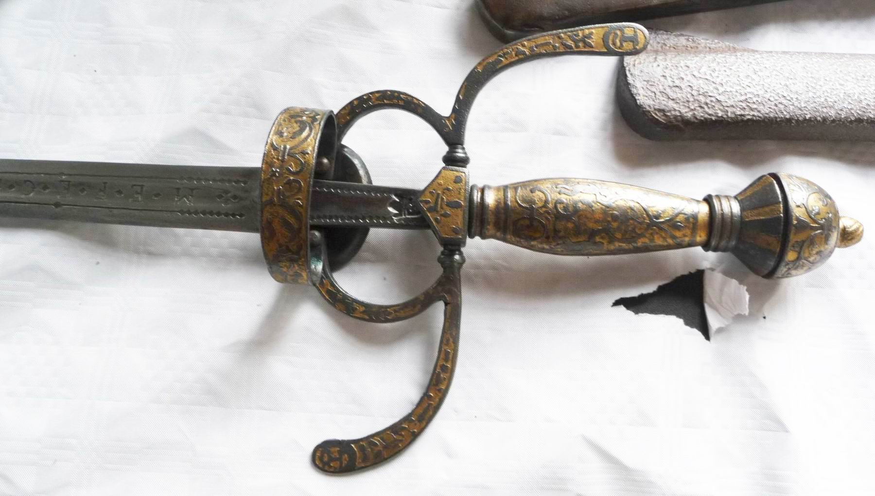 Degen mit Klingeninschrift "Me Fecit Solingen". Eine weitere Marke in Fehlschärfennähe.