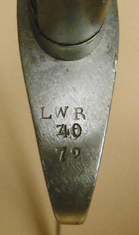 Parierstange oben: LWR 40 72 (Landwehr Regiment 40 Waffe Nr. 72?) An dieser Stelle wurde wohl eine andere Markierung überstempelt.