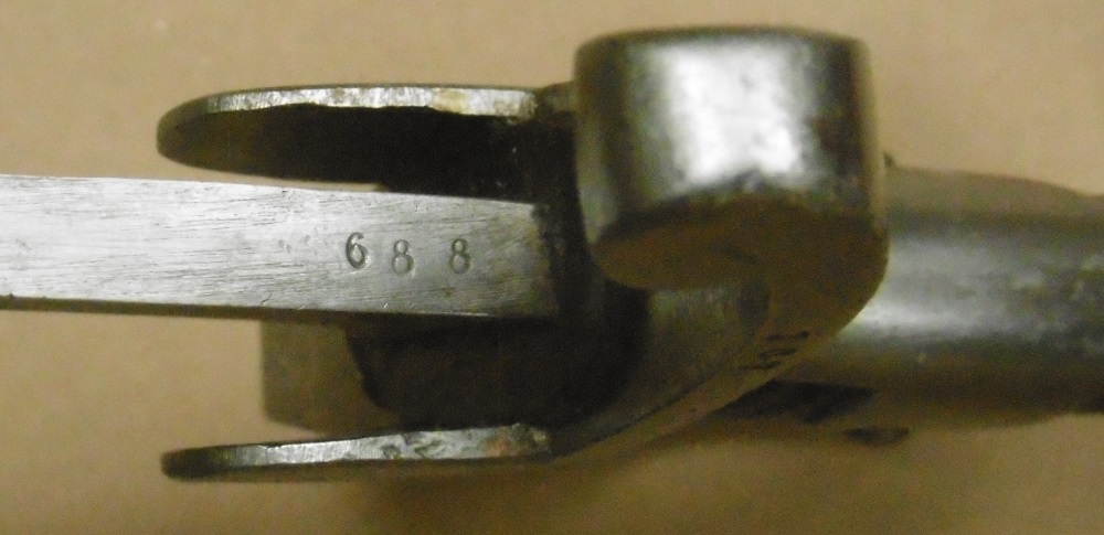 Zum Griffbügel hin: 688 M (Dies dürfte die Depotnummer sein, also der 688. Säbel im Depot Münster oder Minden laut Seifert/Stefanski)