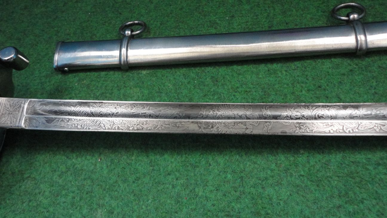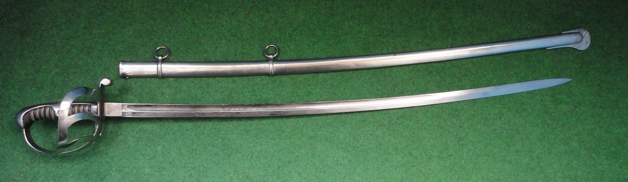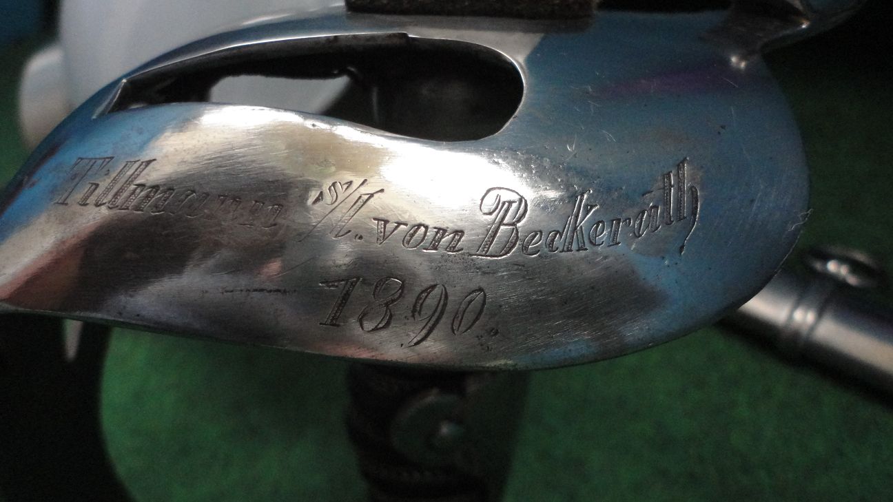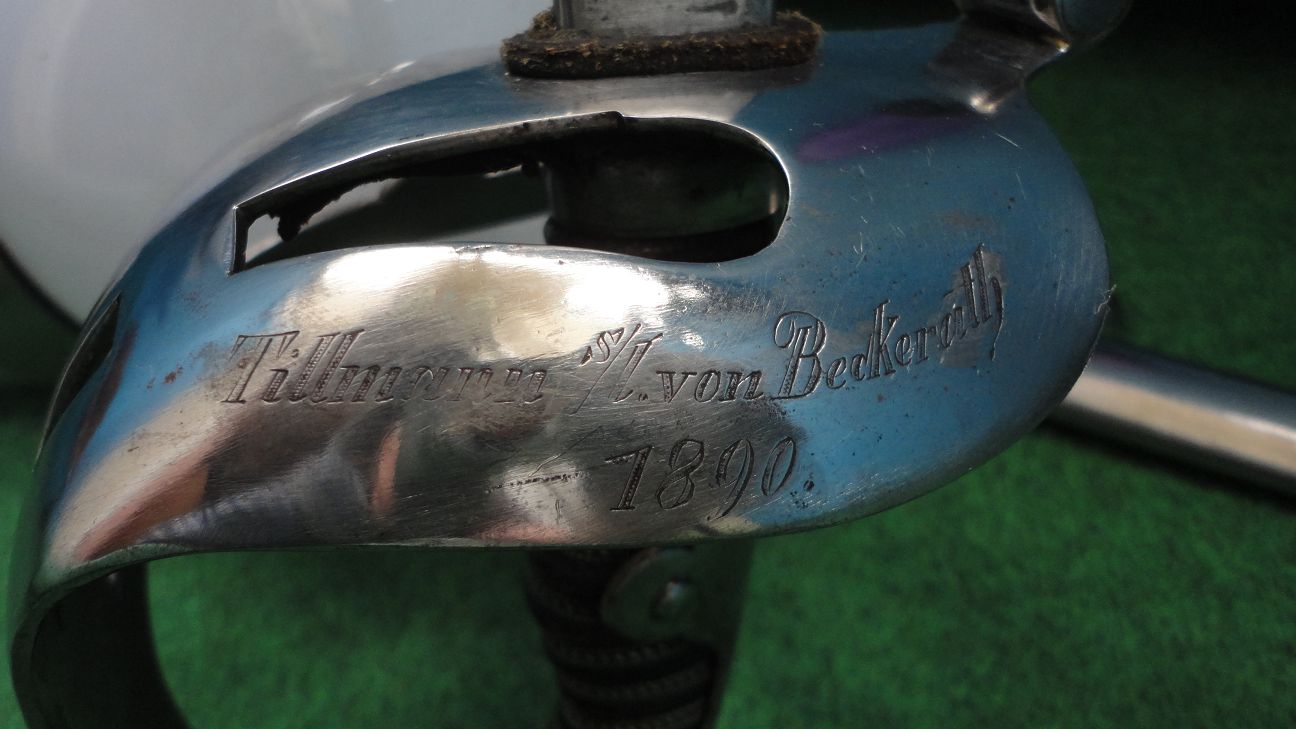 Vor mir liegt ein Kavallerie-Säbel. Auf dem Korb graviert "Tillmann s/l. von Beckerath 1890." Länge mit Scheide ist ca.1000mm, Klingenbreite ca.24mm, Der Korb und die Scheide sind vernickelt, Scheide mit zwei Trageringen, Scheidenbänder sind nicht stromlinienförmig,