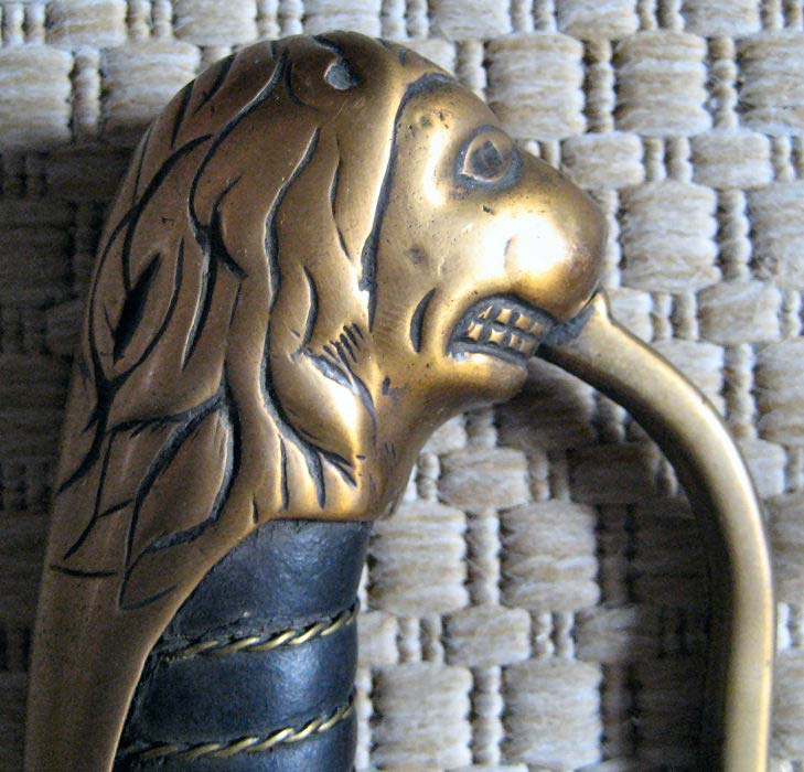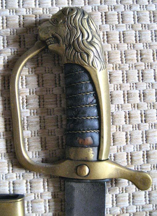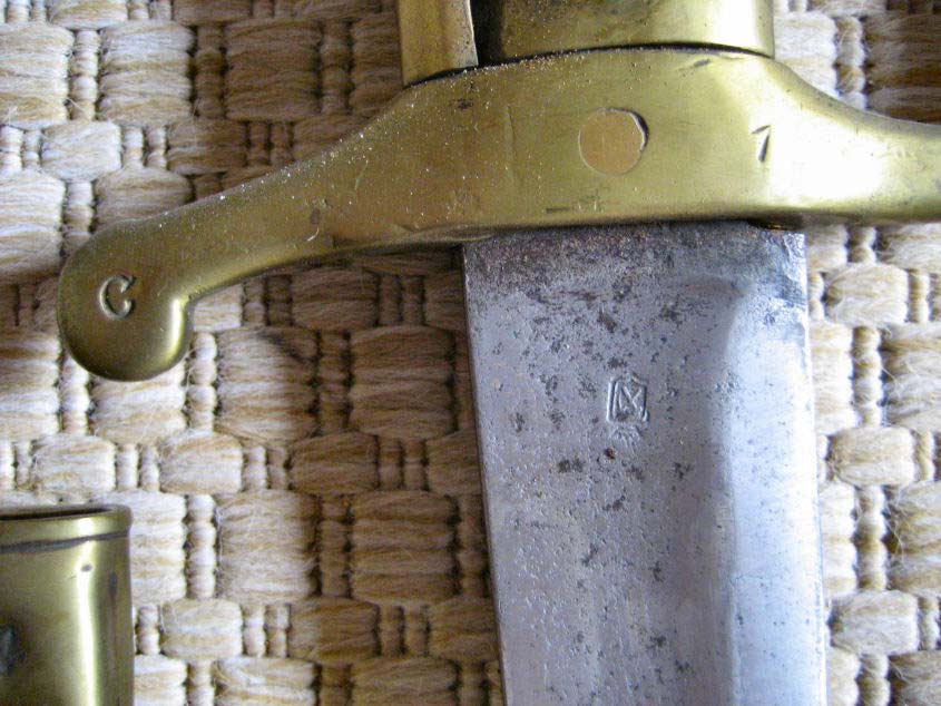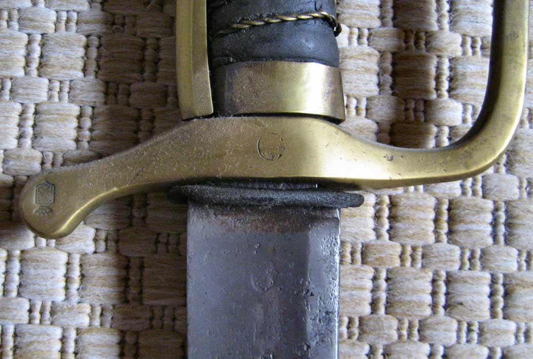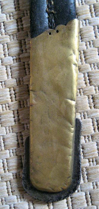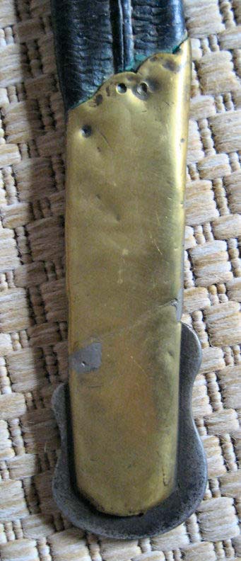 Ortblech (Messing) mit Schleppblech (Eisen!?). Griff, auf der Fehlschärfe der von 1792-1804 verwendete Typ des Frederiksværk-Stempels (Wappen unter Krone).