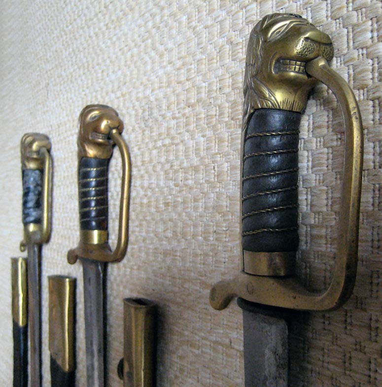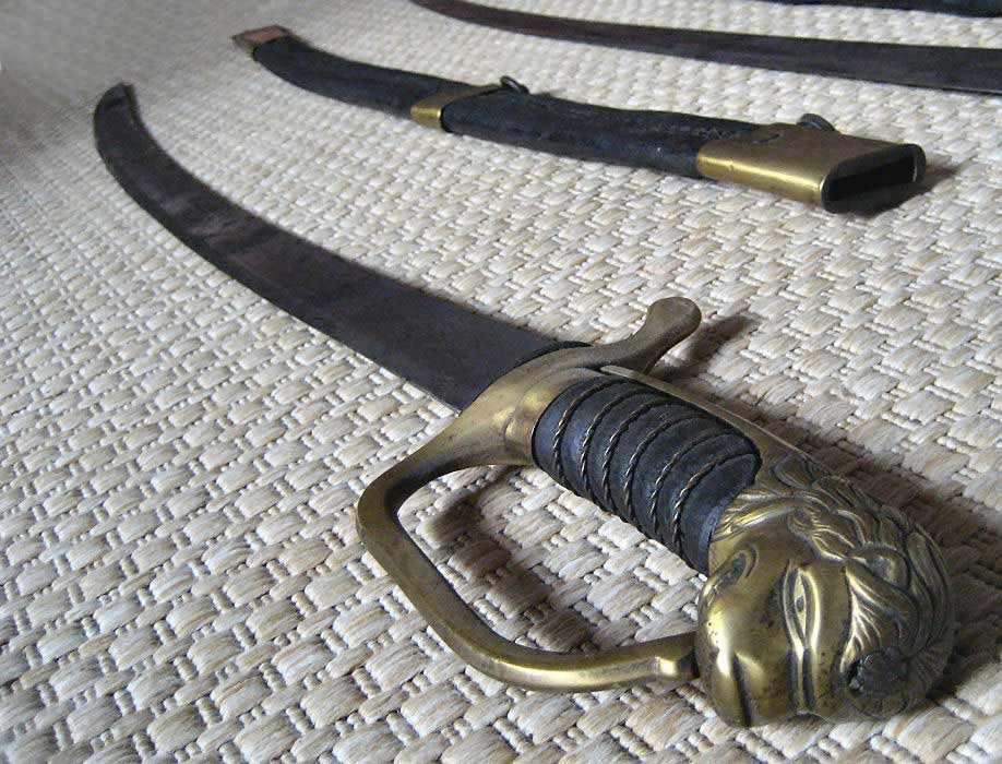 Die drei Säbel aus der Nähe; interessant die geänderte Scheide des rechten Artilleriesäbels (Trageweise ohne Seitengewehrtasche mit zwei Trageringen durch Teilung des Mundblechs).