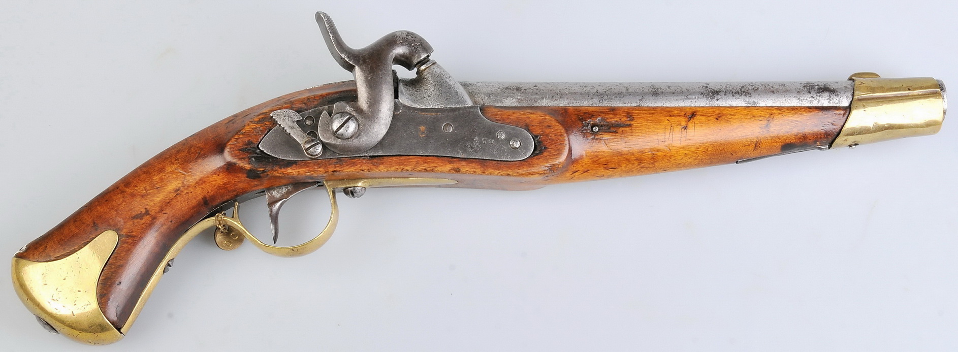 Diese Pistole hat den originalen Anschlagkolben und kann durch den Truppenstempel eindeutig dem Småland Husaren Regiment und damit der Aptierung von 1857 zugeordnet werden.