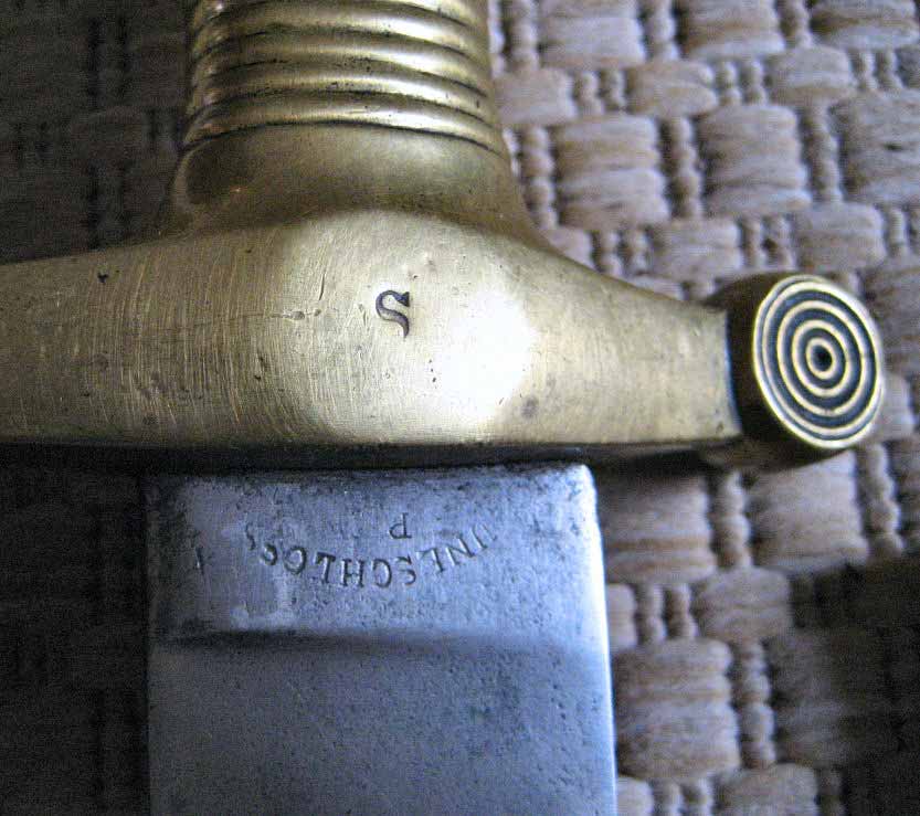 Der "S"-Abnahmestempel findet sich auf vielen schleswig-holsteinischen Waffen dieser Zeit; mit und ohne Krone. Manche Abnahmebeamten ("W" = Wendell, (Fraktur) "D" = Danielsen) sind bekannt, die Herkunft des "S"-Stempels konnte ich noch nicht herausfinden (vielleicht preußisch: Das S-H-Kriegsdepartement hatte zeitweise Preußen um Unterstützung bei der Waffenabnahme gebeten).