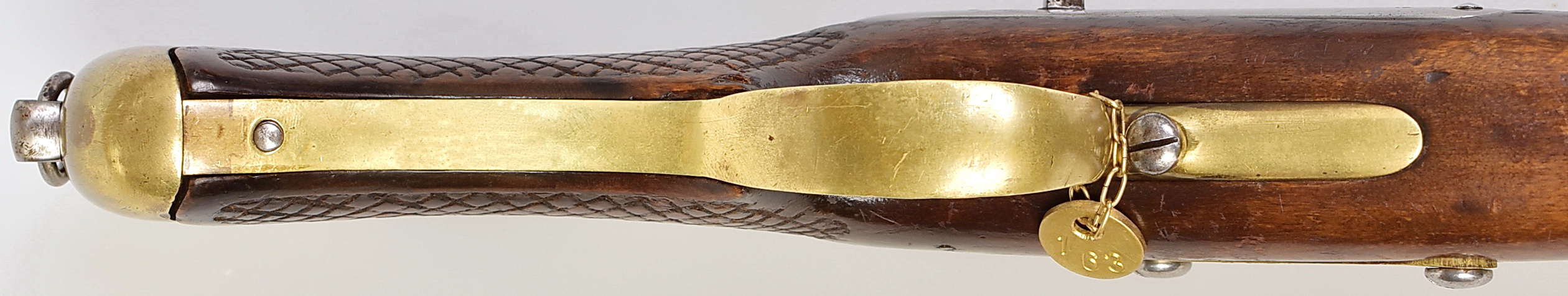 Auf der Laufunterseite die Stempel MOF (Magnus Oscar Fahlgren (geb. 1825) - Besichtigungsrüstmeister bei Husqvarna) und P. So ist sie mit Sicherheit als schwedische Pistole zu identifizieren. Der Stempel war bei Pistolen dieser Zeit üblich.