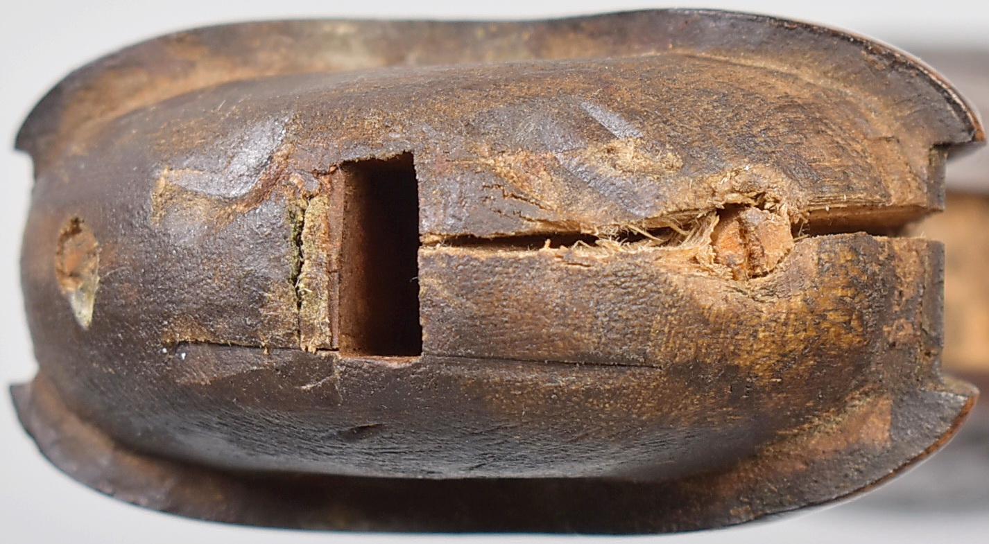 Einige Teile sehen so aus, als ob sie schon einmal genutzt wurden (z.B. Kolbenkappe, Abzugbügel). Es ist möglich, dass die Kolbenkappe am Anfang der Versuche, mit zwei Schrauben befestigt war. Wenn also ein Kolbenring angebracht werden sollte, dann ist auch das labile Gewinde im Messing zu erklären. Das Loch in der Kolbenrückenschiene war mit Sicherheit schon vorhanden, und diese mit einer Holzschraube befestigt. Das Gewindeloch wurde einfach ganz durchgebohrt. Wie auch immer - so etwas wäre bei einer neu gefertigten Waffe nicht zu erklären.