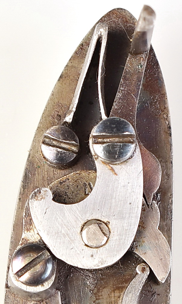 Der Abstand von der Lade- zur Feuerrast an der Nuss beträgt beim vorliegenden Stück 7,5 mm. So können höhere Pistons nicht verwendet werden. Der Hahn schlägt bei diesen hohen Pistons in der Stellung "Sicherung" auf das Zündhütchen. Die "Schlagstellung" erreicht er beim vorliegenden Stück nicht.