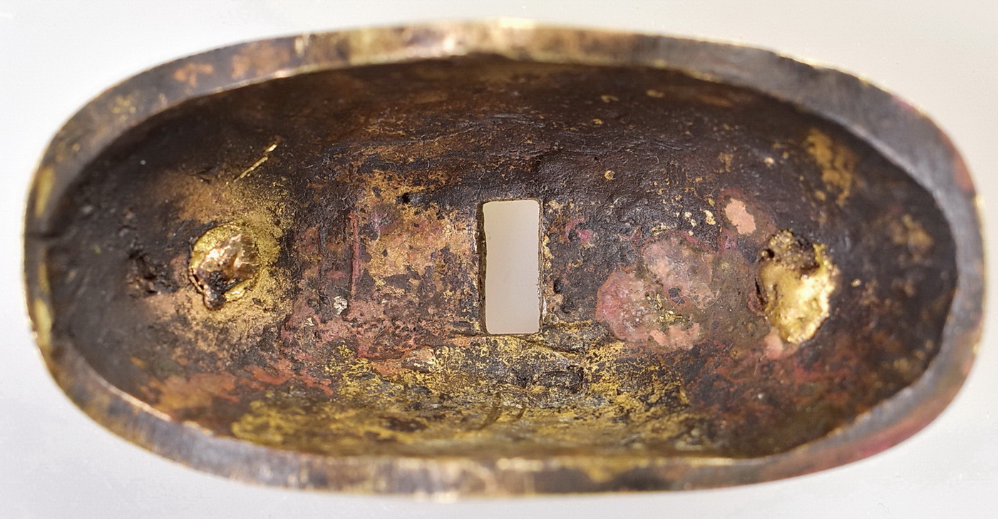 Die Kolbenkappe weist zwei verschlossene Löcher auf. Die Reparaturen sind auch außen zu sehen und dort sehr sauber ausgeführt. Ebenso befinden sich im Kolben zwei korrespondierende Löcher. Die Kolbenkappe war also vorher schon einmal mit zwei Schrauben befestigt.