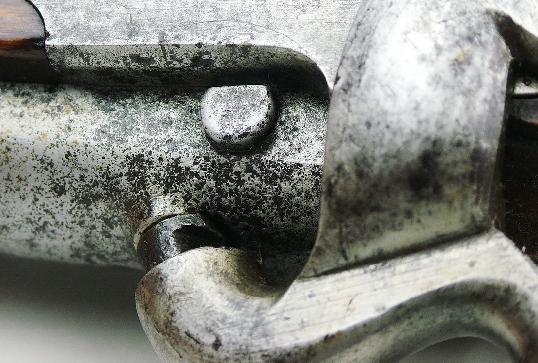 Der Abstand von der Lade- zur Feuerrast an der Nuss beträgt beim vorliegenden Stück 7,5 mm. So können höhere Pistons nicht verwendet werden. Der Hahn schlägt bei diesen hohen Pistons in der Stellung "Sicherung" auf das Zündhütchen. Die "Schlagstellung" erreicht er beim vorliegenden Stück nicht.