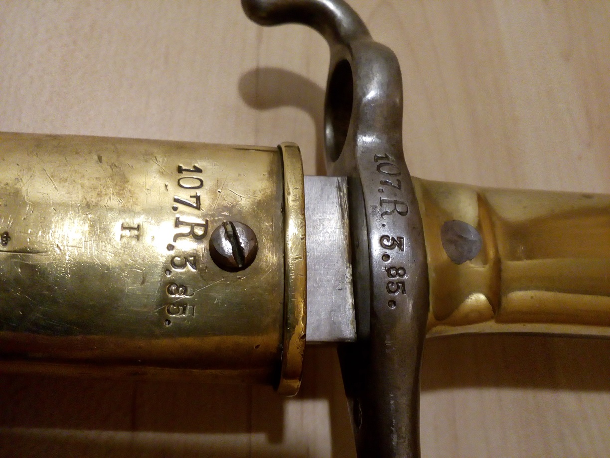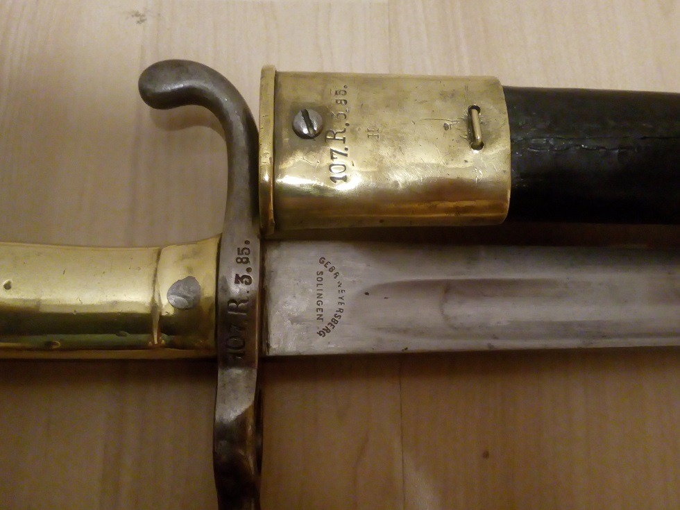 Hallo,ich hänge mich mal dran.Mit einem sächsisch/preußischem Seitengewehr.Ebenfalls Truppenstempel 107.R.2.125. aber preußischer Abnahme.Scheide 134.R.2.101 Die Scheide hat nur eine Punze auf dem Mundblech.Das SG einen unbekanntenStempel uf der Unterseite der Klinge F.G.Maße ohne Scheide Gesamt 595mm,Klinge 466mm Breite 28mm.