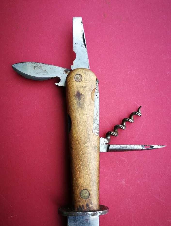 Integriert: Korkenzieher, Ahle, Schraubenzieher, und ein Dosenöffner.