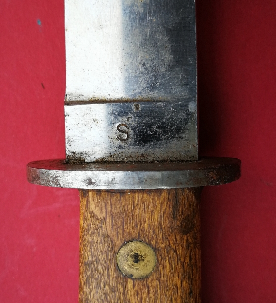 Interessant ist der "S"-Stempel.Solch ein Stempel befindet sich auch auf Fallschirmjäger-Kappmessern der Firma SMF-Typ II.Die Vermutung liegt nah,daß es sich um einen Inspizientenstempel handelt,bedingt durch den Ort der Stemplung und da die Klinge die Reichsbetriebsnummer aufweißt.Die Stücke wurden ungefähr 1943-44 gefertigt.