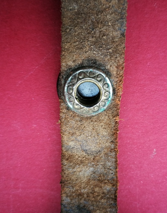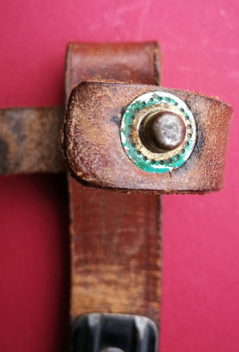 Die Scheide hatte ursprünglich ein Trageclip. Vermutlich ist der gebrochen und deshalb ist auf den Rest des Clips nachträglich ein Trageschlaufe aus Leder nebst Griffschlaufe aufgenietet worden.