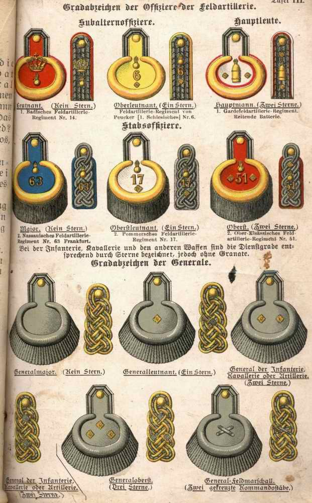 Die Generale. Die Achselstücke sind ähnlich denen der Stabsoffiziere, doch läuft eine goldene Schnur durch das Geflecht. Die Epauletten sind mit steifen silbernen Raupen versehen. Der Generalmajor trägt keinen, der Generalleutnant einen, der General der Infanterie, Kavallerie oder Artillerie zwei, der Generaloberst drei, der Generaloberst im Range General-Feldmarschalls vier Sterne, der General-Feldmarschall zwei kreuzweis übereinanderliegende Kommandostäbe.