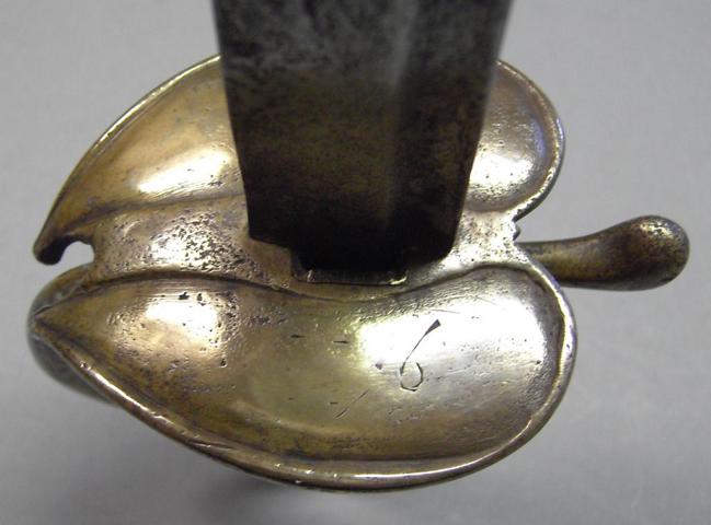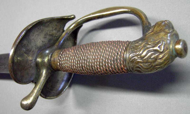 Gegossenes Tombakgefäß mit Knauf in Form eines Löwenkopfs, herzförmigem, symmetrischem Stichblatt mit Randwulst und Parierstange, die in den Handbügel übergeht. Belederte Griffhülse mit gedrillter Kupferdrahtwicklung und oberem und unterem Griffring. Gebogene Rückenklinge mit beidseitigem Zug und am Ort beidseitiger Schneide. Terzseitig bekröntes Monogramm „