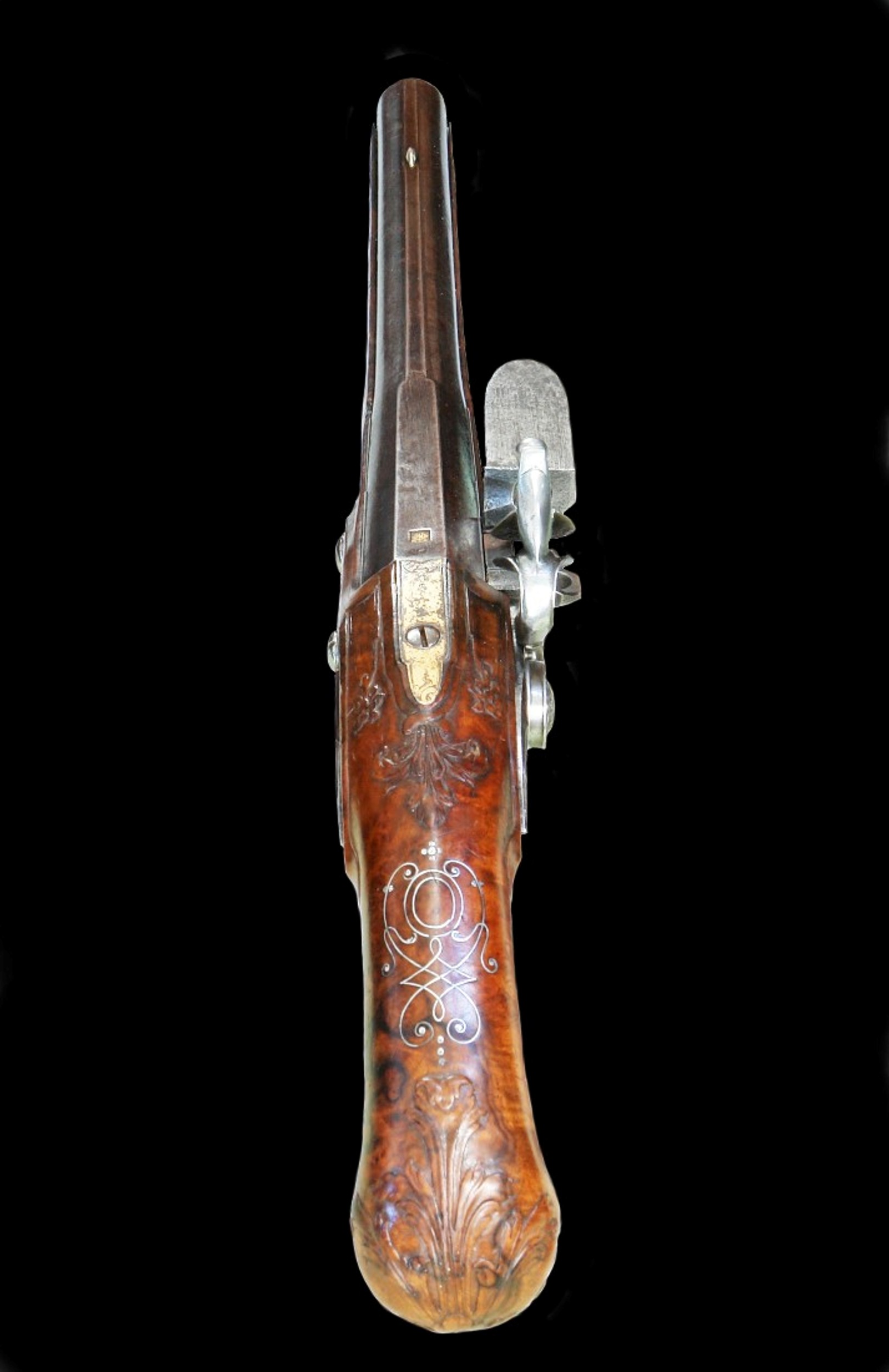 Le Lorain( auch Le Lorraine) aus der Stadt Valence war in Frankreich einer der berühmtesten Büchsenmacher des frühen achtzehnten Jahrhunderts . J. F.Haywart schreibt in seinem Buch „Die Kunst der alten Büchsenmacher“, dass er der einzige nicht in Paris ansässige Meister gewesen sei, der es in seiner Kunstfertigkeit mühelos mit der Elite der Konkurrenten in der Hauptstadt aufnehmen konnte. Von ihm stammt ein sehr hochwertiges doppelläufiges Pistolenpaar, das aus dem Besitz von Charles Bonaparte, dem Vater Napoleons. Waffen von Le Lorain erzielen auf Auktionen regelmäßig Höchstpreise. Da Valence, wo nebenbei erwähnt auch der junge Napoleon seine Ausbildung zu Artilleristen erhielt,nicht weit von der spanischen Grenze entfernt war, lag es für Le Lorain nahe, teilweise die Läufe für seine Pistolen von dort zu beziehen. Spanische Läufe genossen damals einen hervorragenden Ruf und waren deshalb sehr begehrt. So befindet sich bei der vorliegenden Pistole auf dem Lauf auch eine in Gold eingelegte Punze mit dem Wappen von Barcelona und den Initialen AN. Die sehr elegante Pistole hat eine Länge von 40 cm Die Besonderheit dieser Waffe ist der kunstvoll verschnittene, mit Silberdraht verzierte und in einem Adlerkopf als Knauf endende Nussbaumschaft. Schloss, Schlossgegenblech und Abzugbügel zeigen sehr hochwertig ausgeführte Gravuren. Der Lauf ist im hinteren Drittel achteckig und läuft dann nach vorne zu rund aus. Eine Besonderheit ist hier das goldgefütterte Zündloch. Der hölzerne Ladestock endet mit einem Elfenbeindopper. Das Kaliber beträgt etwa 13 mm. Die Schlossplatine und der Hahn haben zeittypisch eine flache, nicht gewölbte Oberfläche.