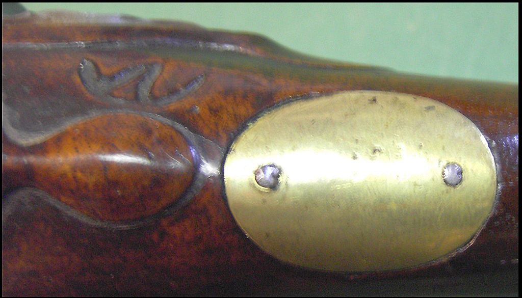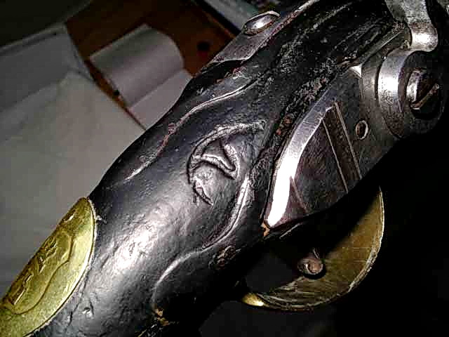 Ich besitze Fotos von zwei Pistolen, einer schwedischen M 1759 und einer preußischen Offizierpistole M 1742, die beide den gleichen Holzstempel an der gleichen Schaftstelle tragen. Hat der Schwedenfan den schon mal gesehen, oder kann er rausbekommen, was es damit auf sich hat? Das zweite Bild zeigt die preußische Pistole.