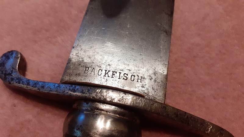 Die Quartseite der Klinge zeigt den Königskopf und den Ritterhelm von Weyersberg, Kirschbaum und Co. Auf der Terzseite hat sich die Firma BACKFISCH verewigt.