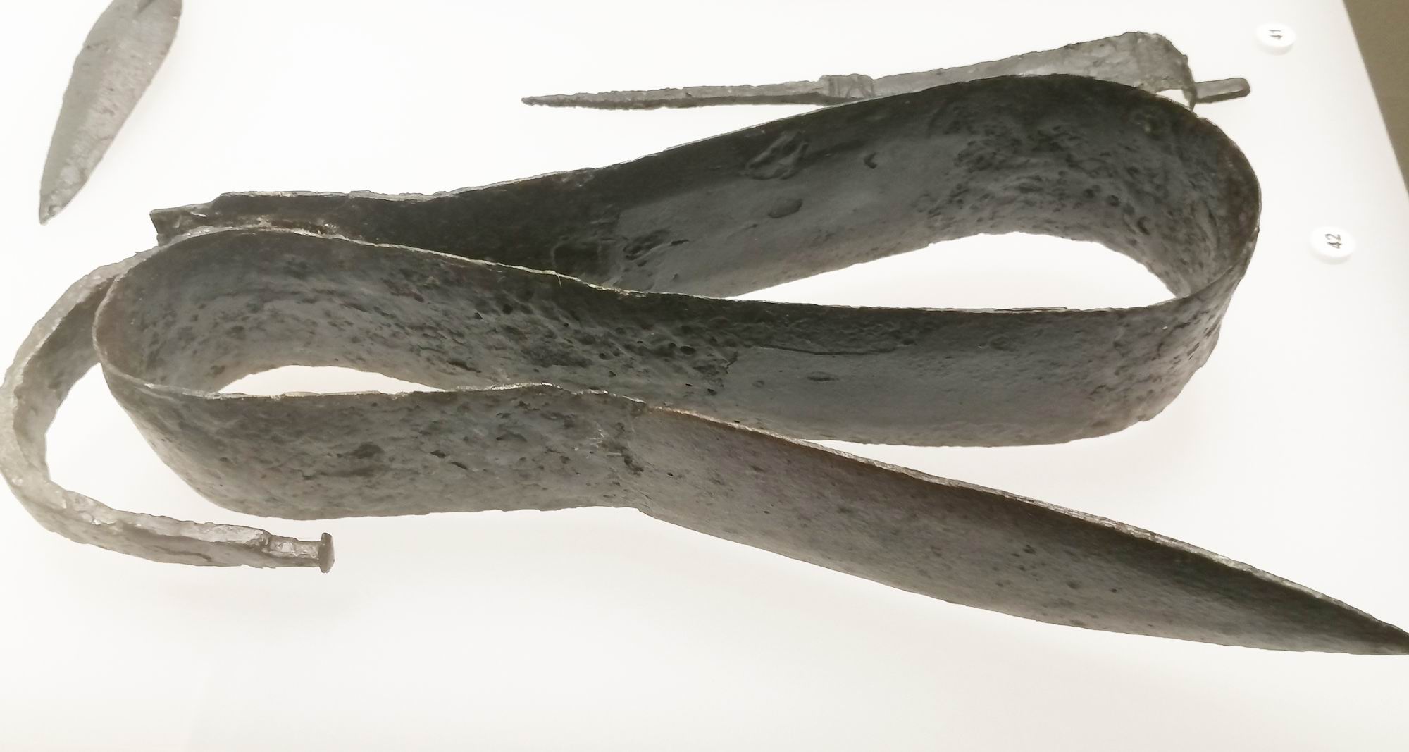 Zu sehen ist eine verbogene Eisenklinge. Man nimmt an, dass solcherart behandelte Schwerter Opfergaben für die Götter sind.