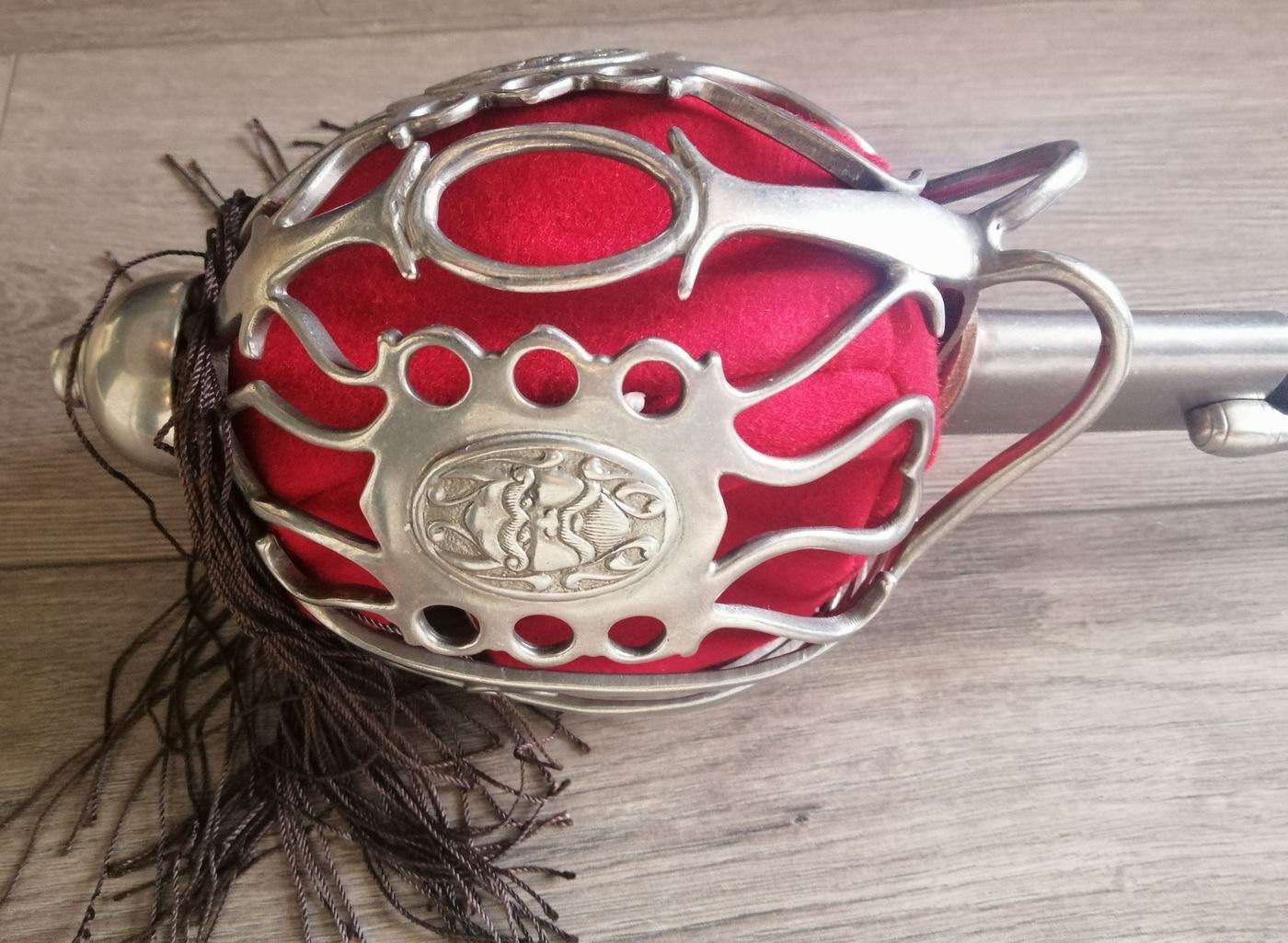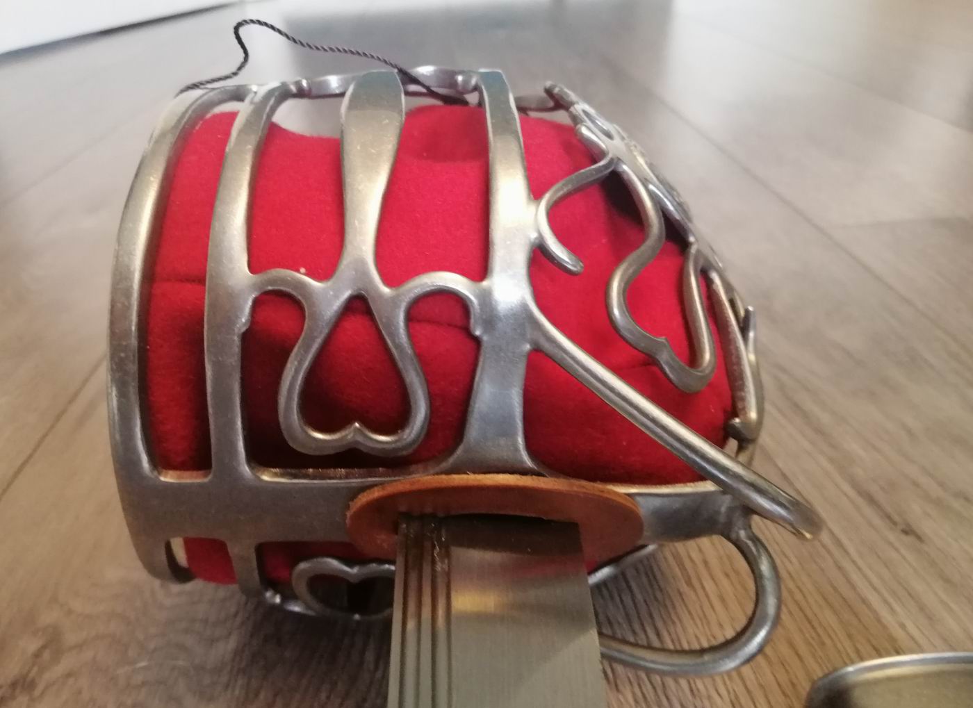 Dieses Schwert hat seine Vorbilder in der Mitte des 18. Jahrhunderts. Der Klingenort hat eine kurze Rückenschneide. In die Hohlbahnen wurde die Inschrift "ANDRIA FARARA" graviert, angelehnt an