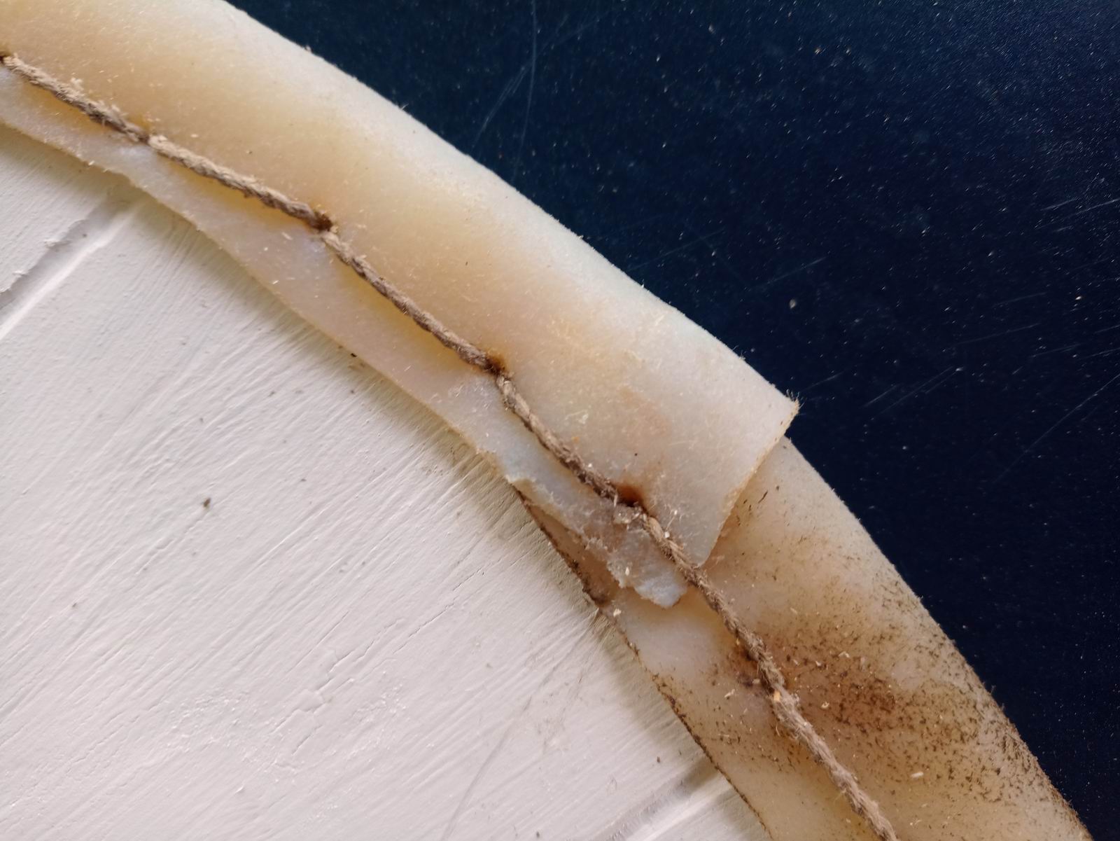 In der Zwischenzeit die Rohhaut in Wasser aufgeweicht und in etwa 6,5cm breite Streifen geschnitten werden. Die noch nassen Steifen mit der Jutekordel um den Schildrand vernäht. Die Löcher durch Holz und Haut habe ich mit der Akku-Bohrmaschine gebohrt. Nach dem Trocknen der Haut schrumpft sie stark zusammen und wird wieder beigefarbig.