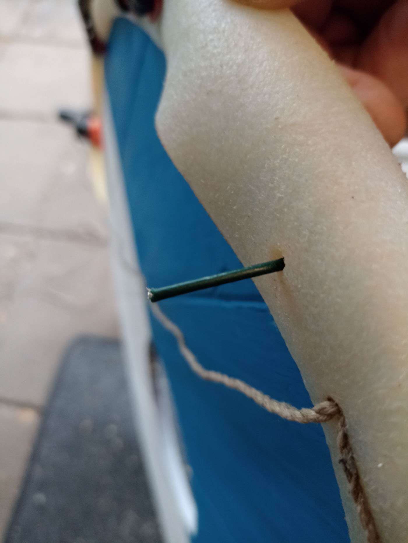 Ein paar Fotos vom Nähen des Randes. Als "Nadeln" fungieren kurze Drahtstücke mit umgebogenem Ende in dem der Faden festgeklemmt ist.