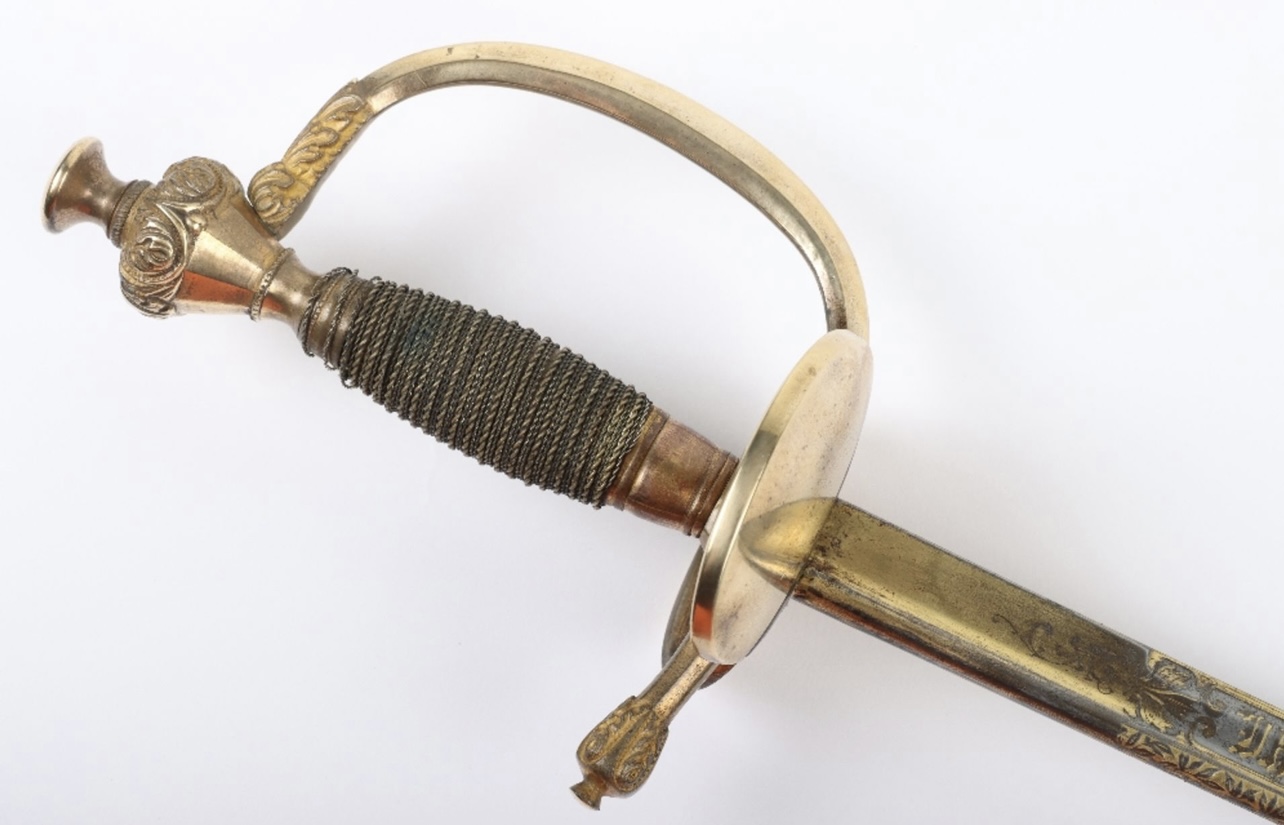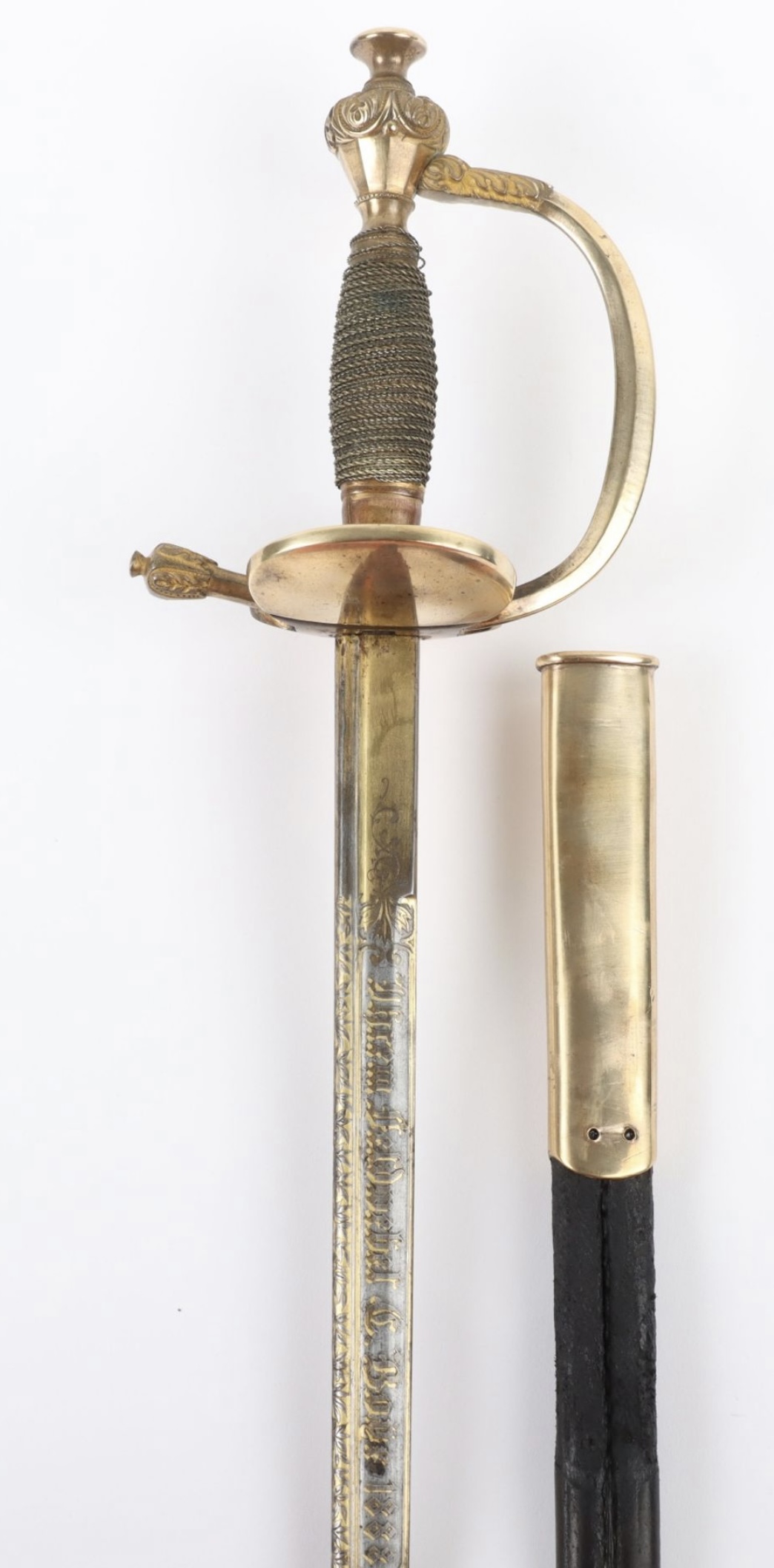 Imperial German Prussian ‘Old Model’ Gilt and Damascus Blade Presentation Sword of Infanterie Regiment (Prinz Moritz von Anhalt-Dessau) Nr 42, fine example with gilded hilt and folding dish guards, wire bound grip. Housed in the original leather and gilt mounted scabbard. Fine slender piped back blade with real Damascus and raised gold gilt inscription, one side ‘Widmung der Unteroffiziere der 2.Comp. 5 Pomm. Inf. Regts. No.42’ and the other ‘Jhrem Feldwebel C Boue 1888’. Some wear to the gold finish and some minor surface staining to the blade but generally good condition. Blade 85 ½ cms, overall 105cms. Some dents to the lower chape of the scabbard and exterior fittings polished but still a fine example of a Prussian presentation sword. The 5th Pomeranian Infantry Regiment 42 was one of the old traditional regiments of the Prussian army raised in 1860.