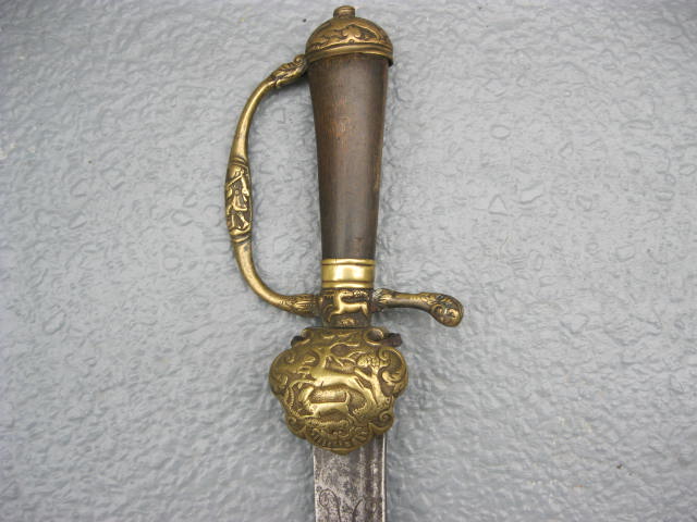 Vom Stichblatt ist nur noch ein Fragment erhalten.Die Muschel nach vorn dürfte abgebrochen sein.