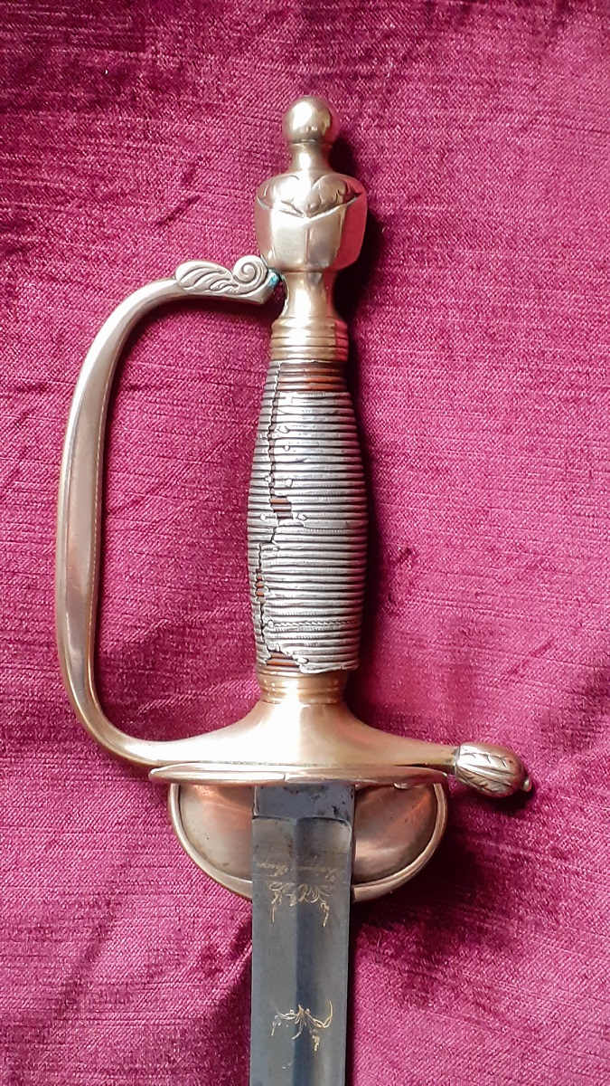Was auffällt ist die Ummantelung des Griffstückes mit Silberblech? Könnte dies ein Unterscheidungsmerkmal zum britischen Degen sein? Oder hatten die das auch?