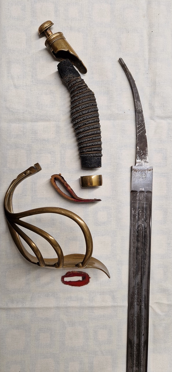 Keine Vergoldung erkennbar. Material wahrscheinlich Tombak. Von mir unbehandelt. Die Klinge hatte leichte Spuren von Flugrost, diese habe ich mit "NeverDull" entfernt. Anschließend wurde die Klinge mit einem säurefreien Waffenöl behandelt.